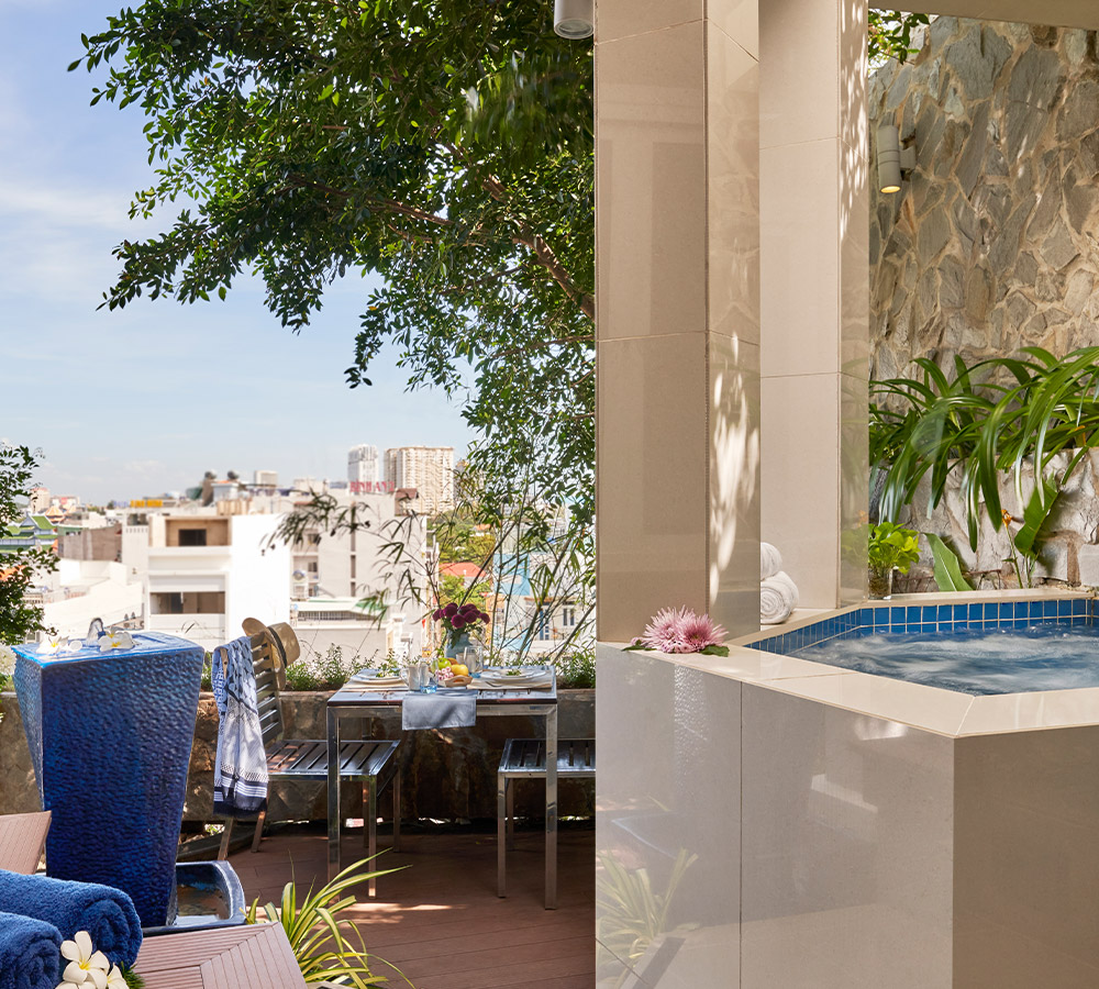 Relax in your own private garden at The Wind Resort – Tropical Hillside Escape, Vietnam, which is positioned on the edge of the hill, overlooking Vung Tau below. The garden includes a dining area and hammock, and you can also enjoy a romantic moment under the stars in the outdoor hot tub. Also featuring a full-sized kitchen, built-in oven, and a bar. The king size bed offers spectacular views of Vung Tau. The suite also includes a leather couch, living room, large-screen TV, private rain shower, and dining table.